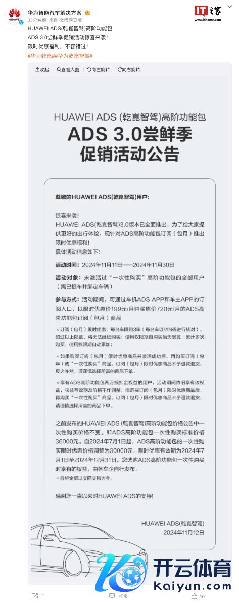 IT之家 11 月 12 日音书,“华为智能汽车防守决策”官方微博本日发布公告,称跟着 HUAWEI ADS (乾崑智驾) 3.0 版块全面推出,现正对 ADS 高阶功能包订阅(包月)推出限时优惠,接头手脚时候从 2024 年 11 月 11 日至 2024 年 11 月 30 日死字开云官网切尔西赞助商,适用于“未激活过‘一次性购买’高阶功能包的沿途用户(需已提车并绑定车辆)”。