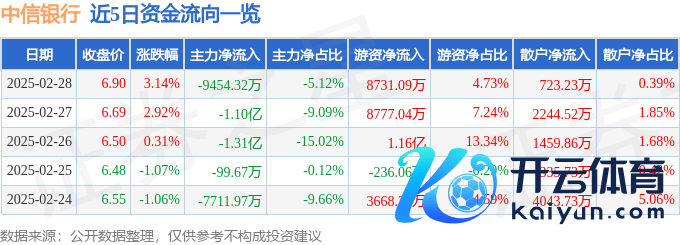 本站音问,完毕2025年2月28日收盘,中信银行(601998)报收于6.9元,高潮3.14%,换手率0.66%,成交量269.64万手,成交额18.47亿元。
