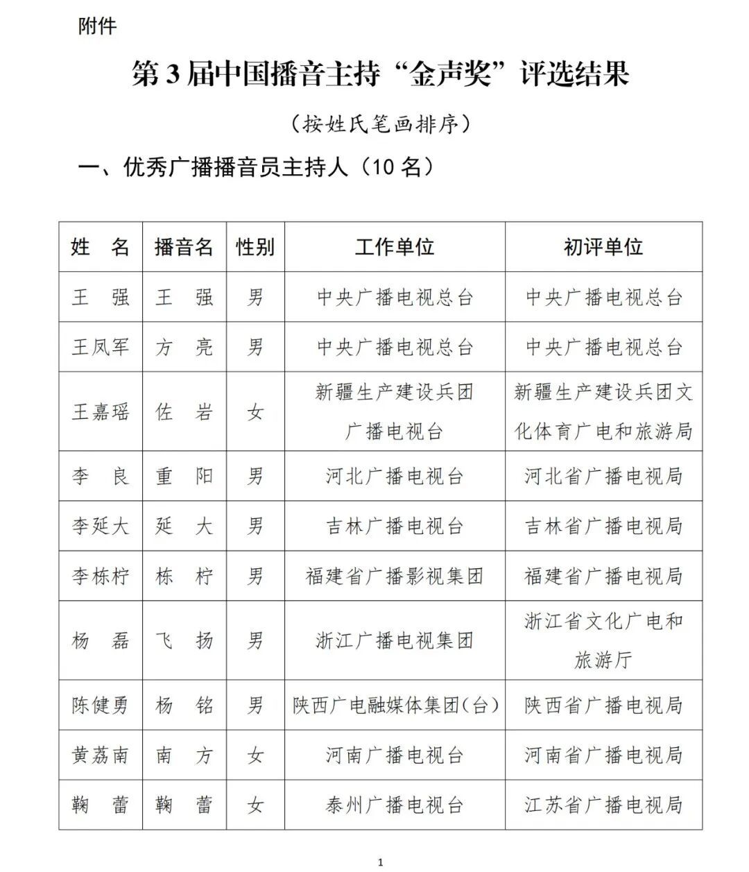 公示泄漏,第3届中国播音主合手“金声奖”历程初评、复评和终评,评比出优秀播送播音员主合手东谈主、优秀电视播音员主合手东谈主各10名。现将评比效果给以公示,公示期为自公布之日起5个责任日。