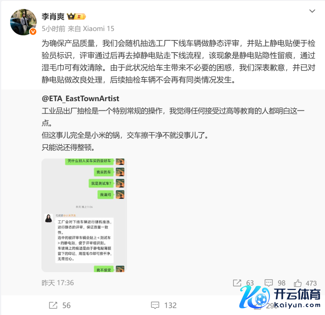 对此,小米汽车副总裁李肖爽和小米集团公关部总司理王化接踵在微博发文恢复: