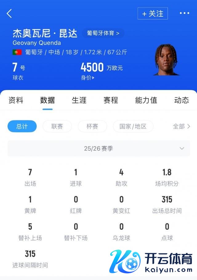 昆达现年18岁,不错胜任边锋位置,本赛季出场7次孝敬1球4助,现在昆达德回身价为4500万欧元。